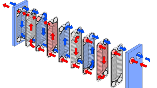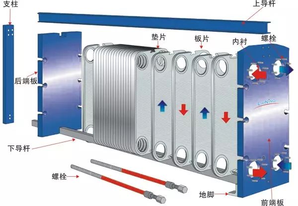 板式换热器是由带一定波纹形状的金属板片叠装而成的新型高效换热器,构造包括垫片、压紧板(活动端板、固定端板)和框架(上、下导杆,前支柱)组成,板片之间由密封垫片进行密封并导流,分隔出冷/热两个流体通道,冷/热换热介质分别在各自通道流过,与相隔的板片进行热量交换,以达到用户所需温度。