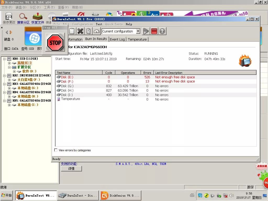 影驰铁甲战将在第一个周期高温转低温测试后出现两块固态硬盘报错,高低温测试结束后Burnintest软件显示两块硬盘分别出现13和526个错误,错误原因均为没有足够的可用空间(掉盘) 。高低温测试结束后进行了一小时的常温存放,并使用H2test软件进行校验,其余三块固态硬盘均未发现坏块。
