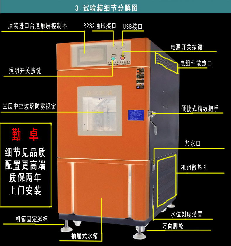 六、LED高温高湿试验箱技术优势 ☆厂家大量生产,供货能力充足。 ☆90%的零部件源自进口,保障性能稳定,持久耐用。 ☆设备外观采用数控成形,钣金缝隙小,稳固性强。 ☆出厂进行精密性能检测,保障符合国标和军标。 ☆设备送货上门,工程师到厂交机,现场培训操作。 ☆保固2年,出现故障会安排技术上门维护。
