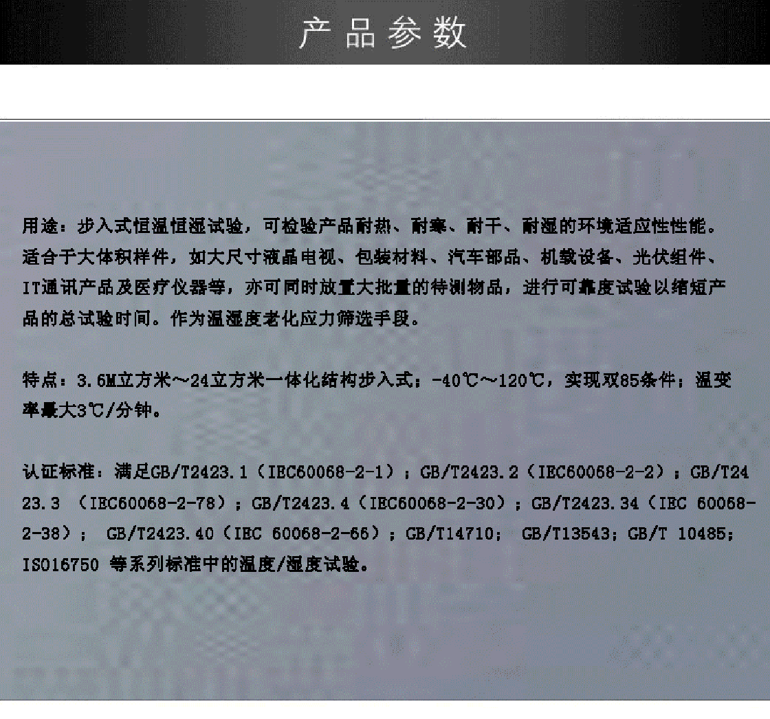 步入式恒温恒湿试验房适用于整机或大型零部件的低温、高温、高低温变化、恒定时热、高低温交变湿热试验等。也称“恒温恒湿室”,可根据用户要求改变工作室尺寸与功能等;拼