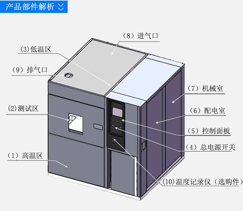 冷热冲击箱又叫冷热冲击试验箱,用于电子电器零组件、自动化零部件、通讯组件、汽车配件、金属、化学材料、塑胶等行业,国防工业、航天、兵工业、BGA、PCB基扳、电子