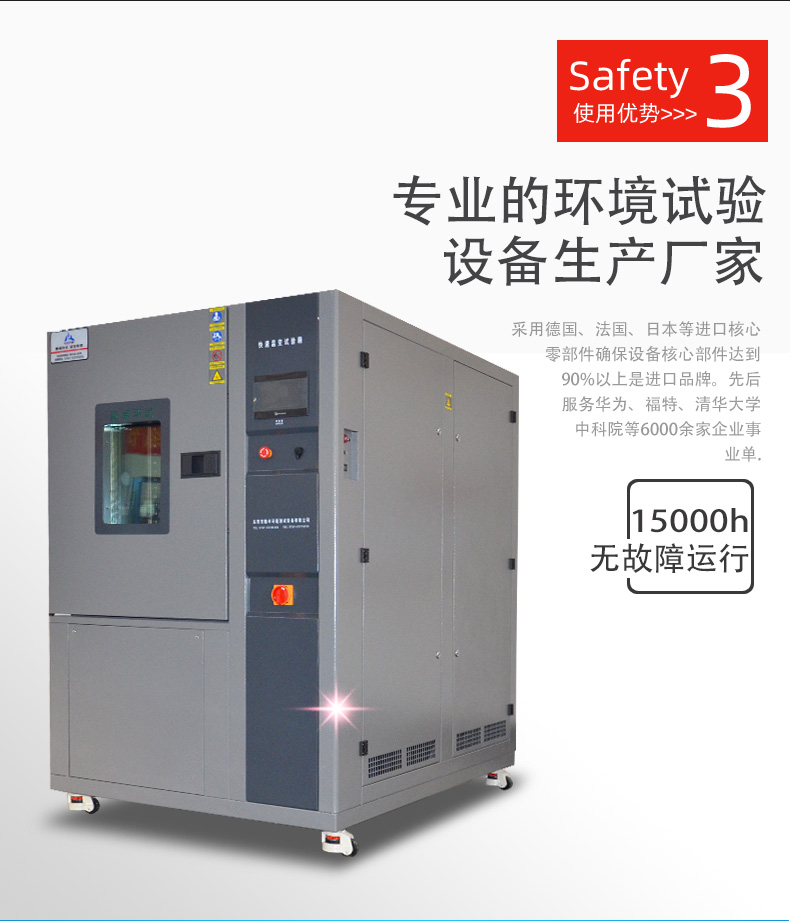 冷热冲击试验箱是集成电路做温度冲击应力测试的可靠性试验设备。具备快速转变温度的功能,比如从高温到低温或者从低温到高温完成温度转换并稳定的时间为3~5min,通过快速的温度交替转换,改变样品外在环境应力,使样品产生热应力和应变,使潜存于产品中的瑕疵浮现,以避免该产品于使用过程中,受到环境应力的考验时而导致失效,造成不必要的损失,对于提高产品出货良率有着十分好的效果。